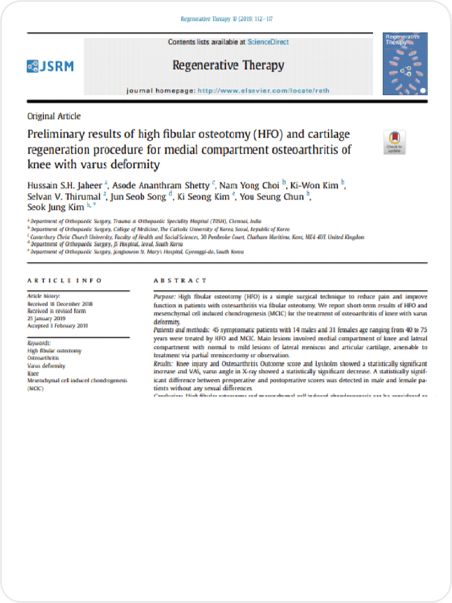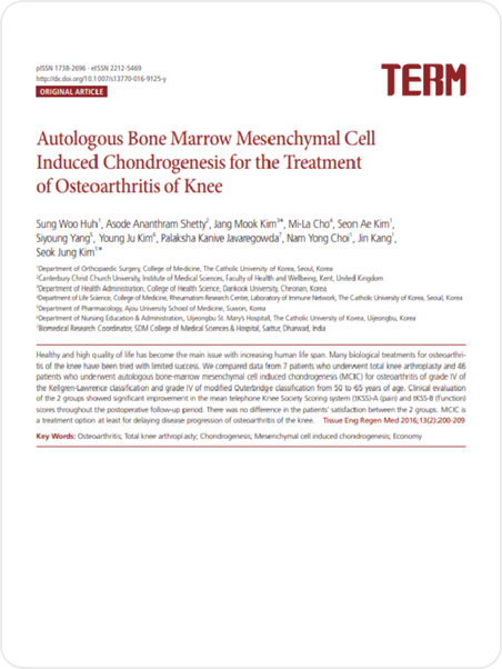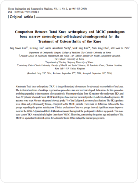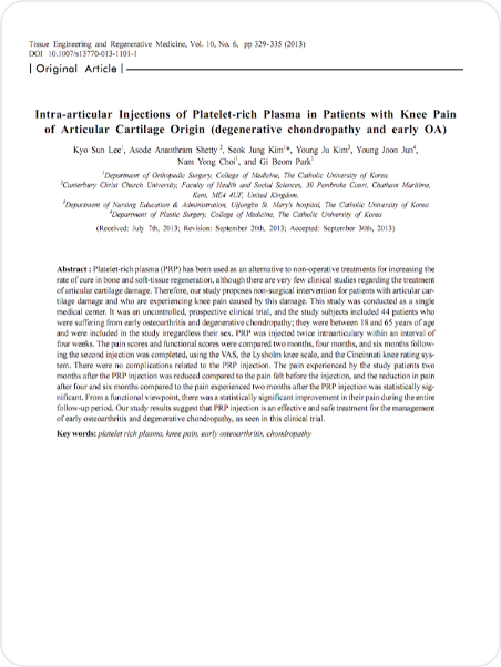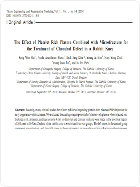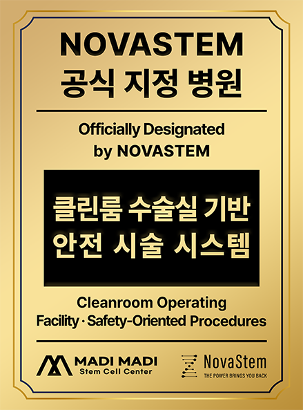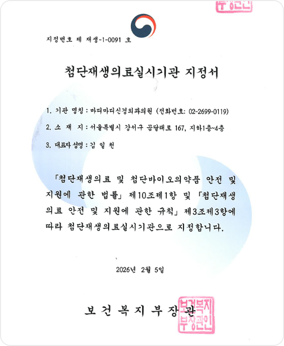 LICENSE 줄기세포 치료 연구 및 임상 근거 보건복지부 지정첨단재생의료 실시기관 본 의료기관은 보건복지부가 인증한 첨단재생의료 실시기관으로,국가가 인정한 재생의료법에 따른 관리·감독 체계 하에서보다 안전하고 신뢰할 수 있는 줄기세포 치료를 시행합니다. Research-Based Stem Cell Therapy 줄기세포 치료의 과학적 연구 기반 줄기세포 치료는 손상된 조직의 회복과 기능 개선 가능성에 대해다양한 연구가 진행되고 있는 분야로, 학술 논문들을 통해 세포의재생 잠재력과 염증 조절, 미세환경 개선과 관련된 생물학적 기전들이학술적으로 보고되었습니다. 다만 치료 반응은 개인의 건강 상태와 질환 단계, 적용 방법 등에 따라차이가 있을 수 있습니다. 마디마디 줄기세포 치료센터는 발표된 연구 자료와 임상적 근거를바탕으로 안전 기준과 프로토콜을 준수하며 치료를 진행하고,환자 상태를 고려한 의료진 상담을 통해 신중하게 접근하고 있습니다. 무릎 연골 손상 환자에서 PRP 주사 치료 효과 연구 PRP의 중추신경계 질환 치료 가능성 연구 자가 골수 줄기세포의 무릎 연골재생 효과 연구 PRP와 미세천공 병합 치료의 무릎 연골재생 효과 연구 단일단계 세포·기질 기반 연골재생 기법 개발 연구 CD34 + 세포 함유 PRP의 탈모 치료 효과 연구 어깨 회전근개 수술 후 PRP 주입의 치유 효과 연구 무릎 연골결손 모델에서 PRP와 미세천공술 병합 시 연골재생 효과 향상 확인 무릎 내측 관절염에서 교정 절골술 (HFO)과 연골재생 병합치료의 임상 효과 평가
